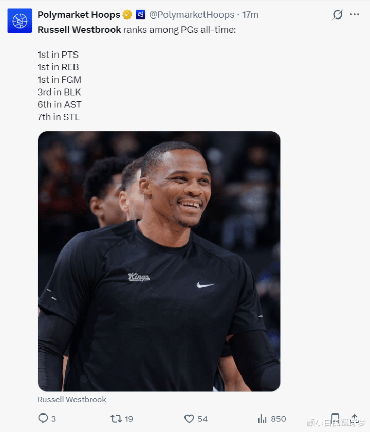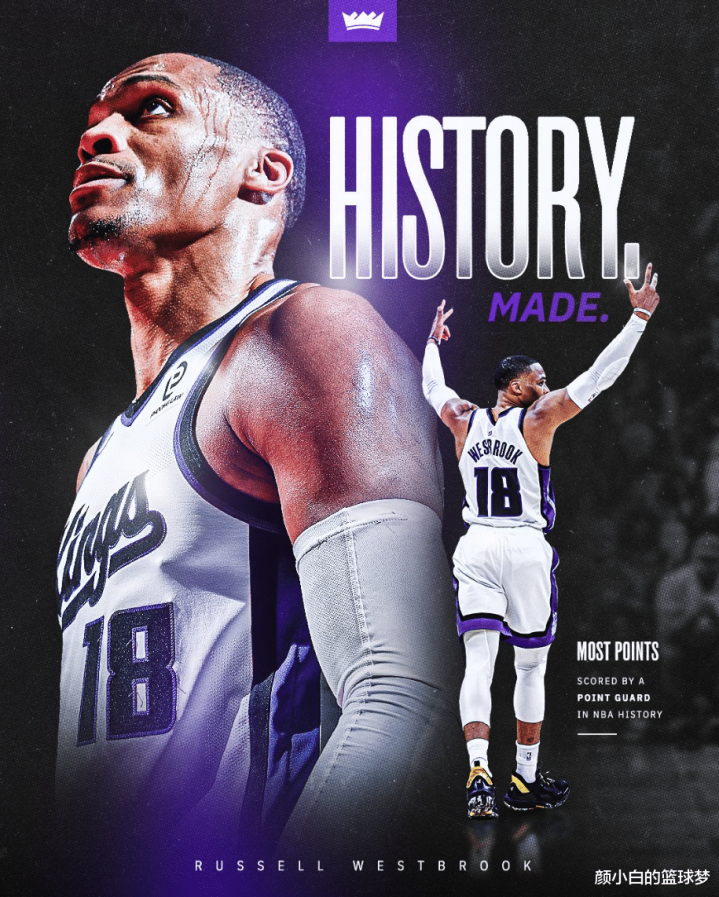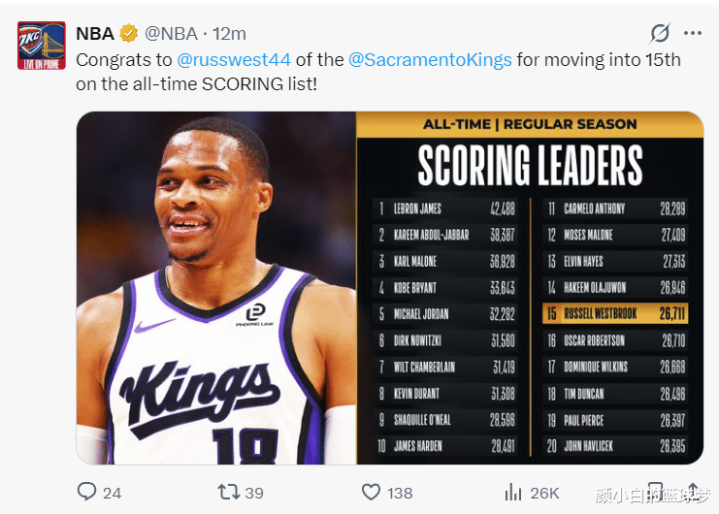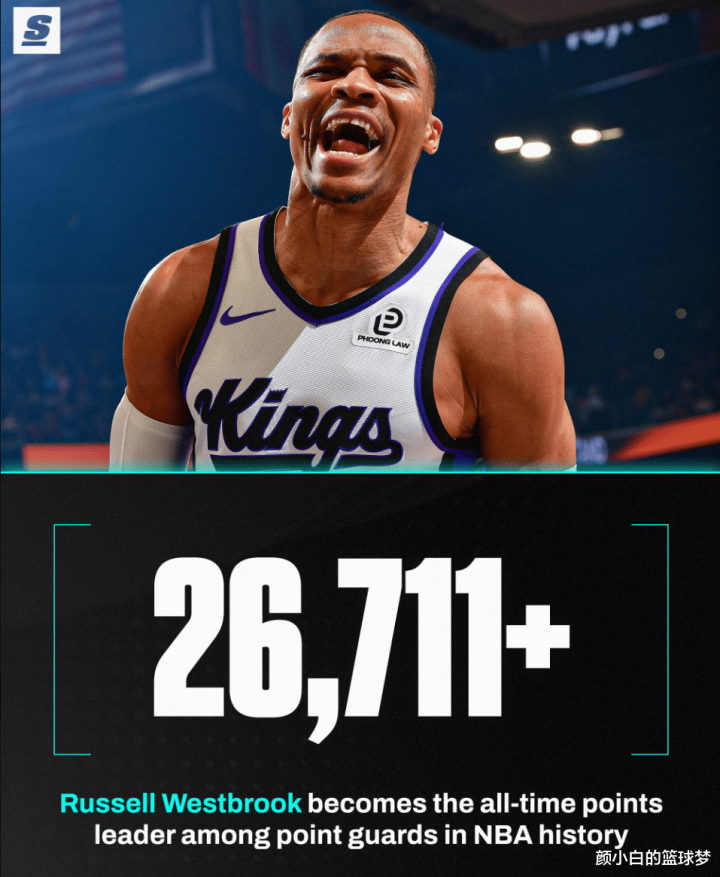 北京时间1月3日,国王102-129惨败太阳,这是一场毫无悬念的比赛,太阳一直牢牢掌控局势,末节更是一波32-19将国王按在地板上摩擦。37岁的威少这场比赛却迎来了里程碑的夜晚,他的历史总得分超过26711+超过大O,成为历史控卫得分王。