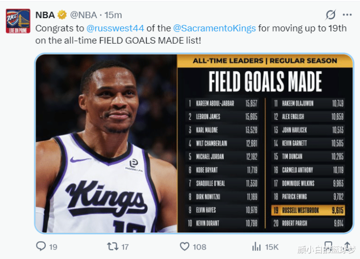 此役威少的里程碑还不止一项,他的运动战进球9615个也升至历史第19位。